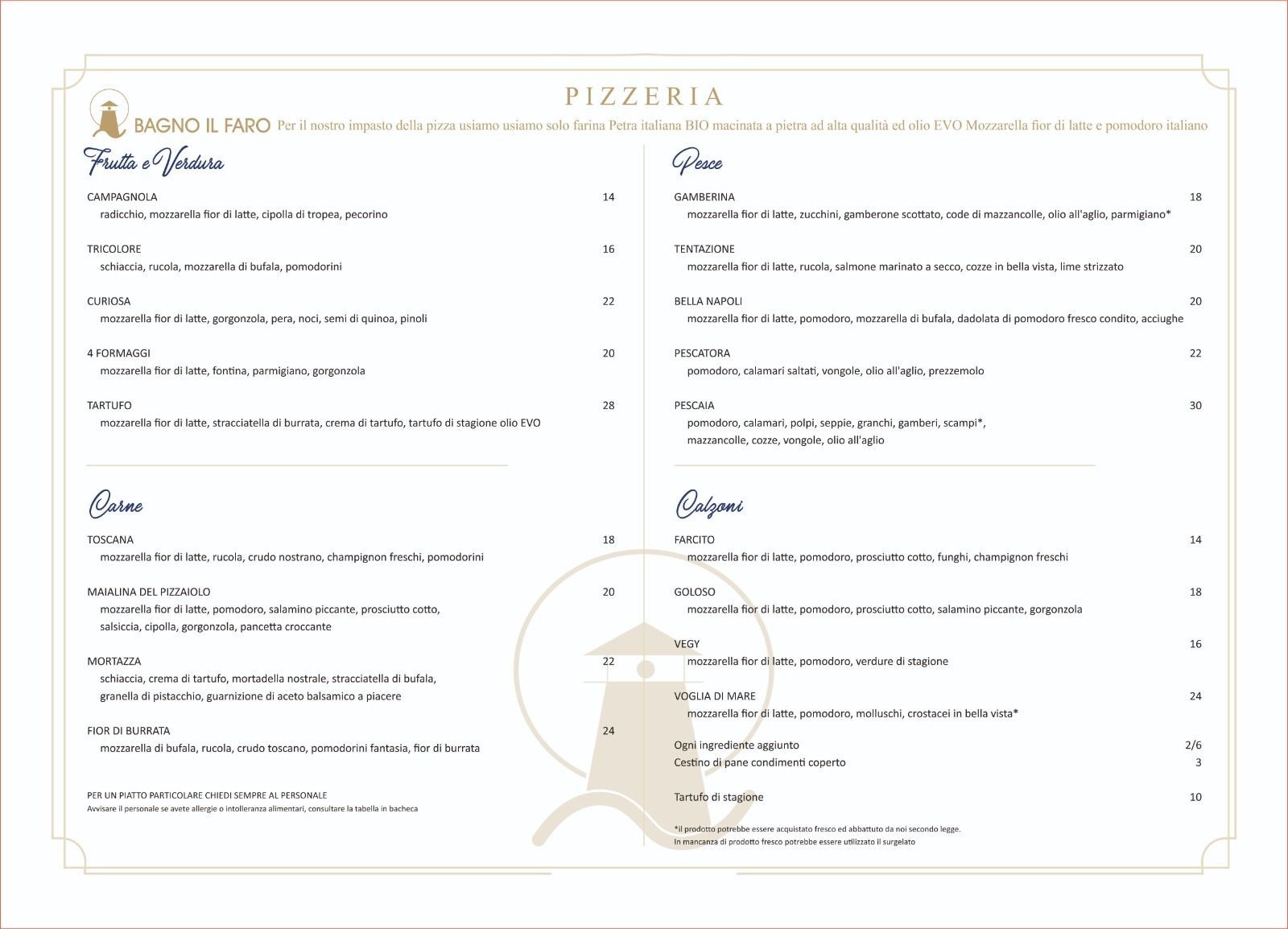 Il Ristorante Pizzeria Bagno Il Faro, guidato con passione dallo chef Alessio Milani, si distingue tra le eccellenze culinarie di Castiglione della Pescaia, grazie a una posizione unica e a una proposta gastronomica irresistibile. Rinomato ristorante, offre piatti di pesce come il crudo del Faro, gli spaghetti allo scoglio e i gnocchetti ai cinque crostacei reali oltre alla scacchiera di ravioli di pesce all'uovo, con agrumi e bottarga. Tra i secondi di mare, spiccano le specialità di pesce fresco, selezionabile ogni giorno al bancone, e proposte originali come gli hamburger di polpo. Anche le pizze riflettono la qualità di ingredienti certificati e scelti con cura. Per esaudire ogni desiderio, il personale è sempre disponibile a soddisfare ogni richiesta, regalando ai clienti un’esperienza culinaria unica e personalizzata.